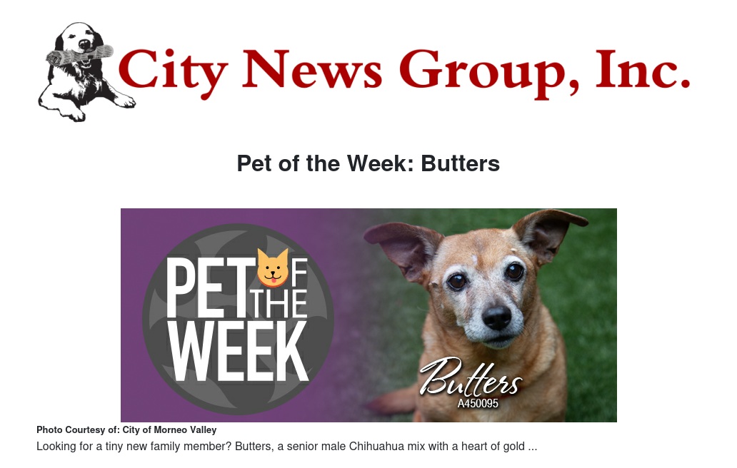 If you would like to make Butters or any pet from the Moreno Valley Animal Shelter part of your family, please contact the Moreno Valley Animal Shelter at 951.413.3790 or visit moval.org/pets.