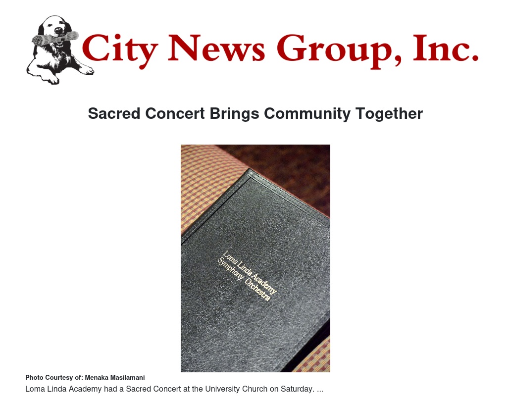 Loma Linda Academy held a special vesper concert Saturday, Nov. 15 at the University Church. The Sacred Concert started with an Overture by George Frederic Handel. Orchestrated by Larry Kidder, the Symphony Orchestra was comprised of the high school students. Natasha Thomas joined the orchestra on harp and Gerald Cheng on violin for the song "Beneath the Cross of Jesus."