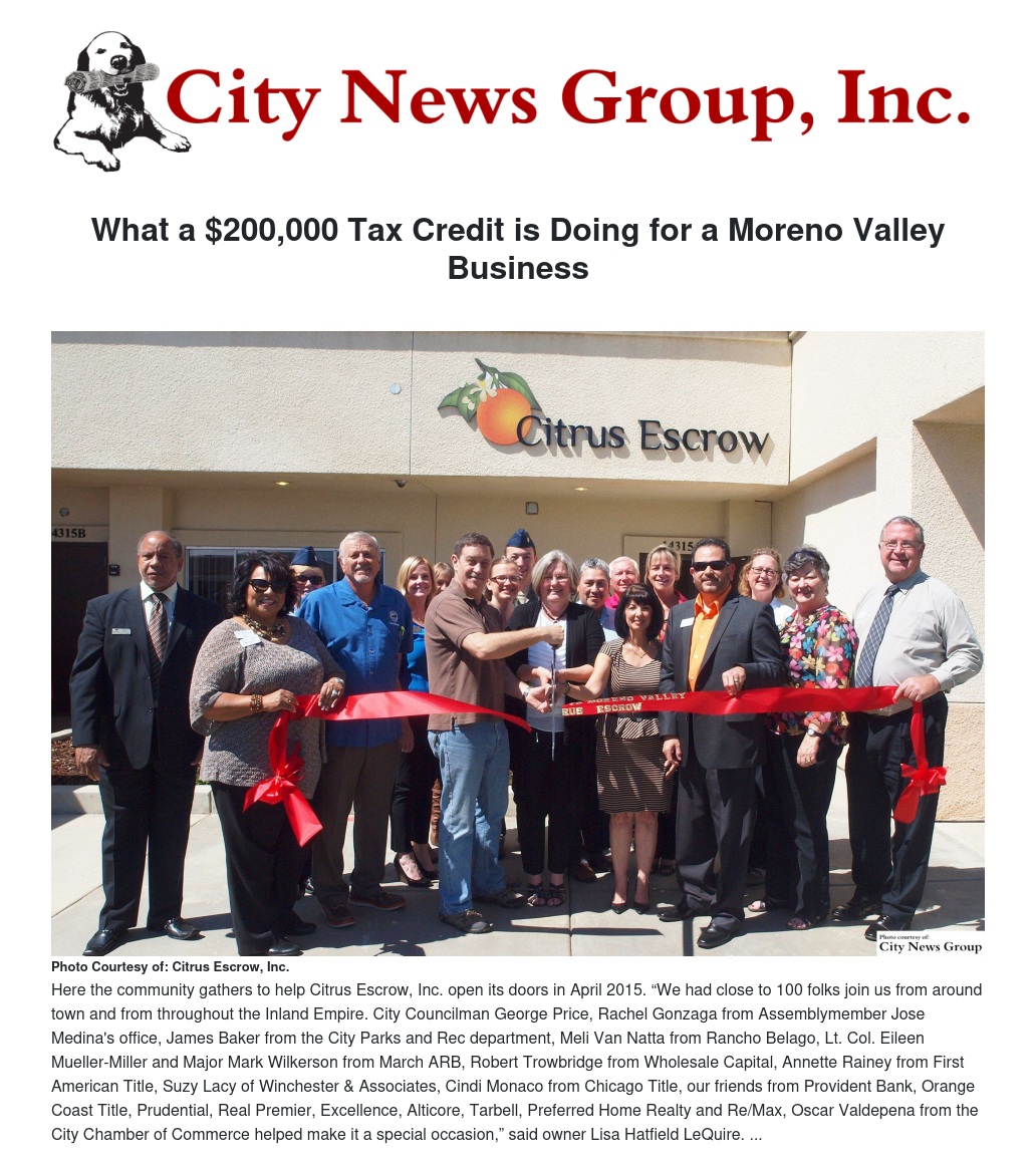 "This credit is meant to help small businesses grow.. and boy are we growing," owner Lisa Hatfield LeQuire, stated on Citrus Escrow's Facebook page. "Huge thanks go out to the Moreno Valley Chamber of Commerce for promoting this program!"