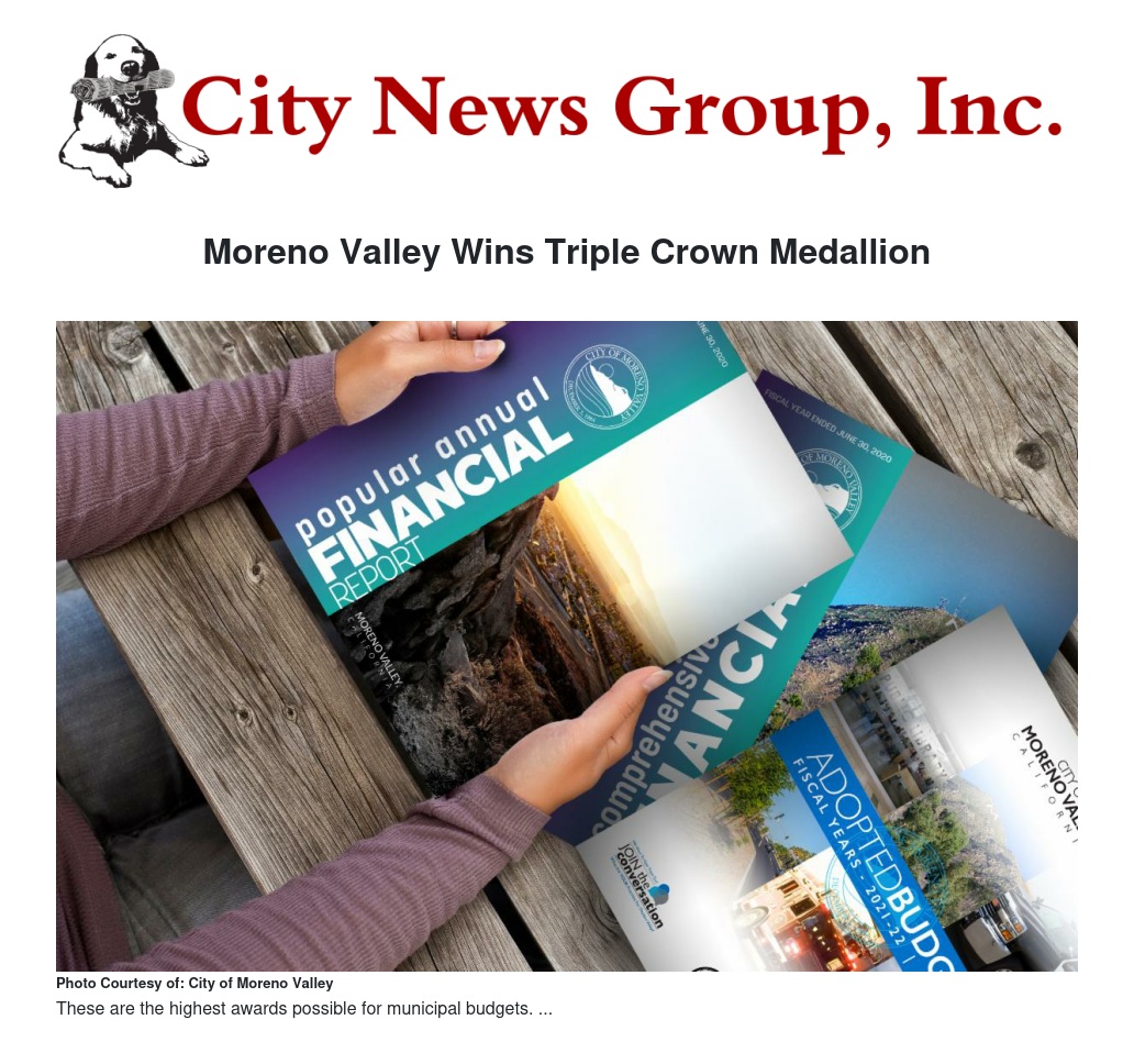 Moreno Valley's Popular Annual Financial Report (PAFR) was judged based on the information presented, reader appeal, understandability, distribution, and the PAFR's creativity and usefulness, among other metrics. The GFOA noted the City "substantially met the requirements" of the award criteria.
