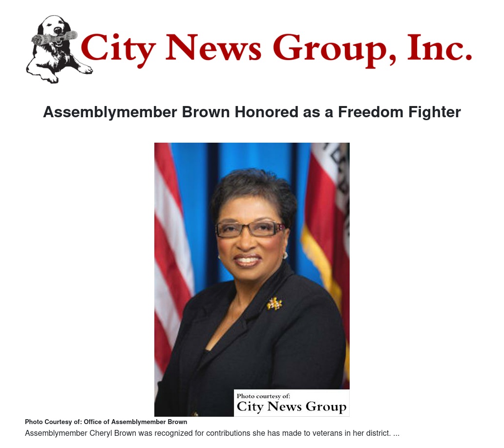 Assemblymember Cheryl R. Brown (D-San Bernardino), chair of the Assembly Committee on Aging and Long-Term Care, was honored as a 2015 Freedom Fighter by the Disabled Veterans Business Alliance at their annual capitol conference.