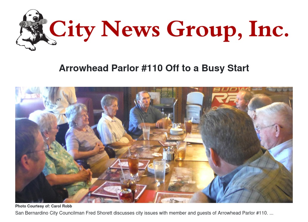 The Parlor will suspend its monthly luncheons until fall. The most recent one was held on June 26, with brother and San Bernardino City Councilmember Fred Shorett as the featured speaker. Earlier that same week, Arrowhead #110 dedicated the City of Fontana on the occasion of its 100th anniversary. The dedication team included PGP Jim Smith, Arrowhead Parlor former Presidents Mike Anderson and Garry Devlin, and Board of Supervisor members Josie Gonzalez and Janice Rutherford, who are both also members of Arrowhead #110.