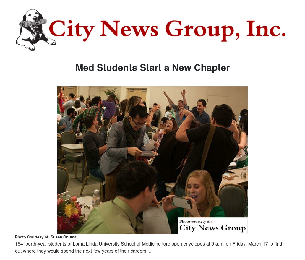 LOMA LINDA>> Surrounded by friends and family, 154 fourth-year students of Loma Linda University School of Medicine tore open envelopes at 9 a.m. on Friday, March 17 to find out where they would spend the next few years of their careers.