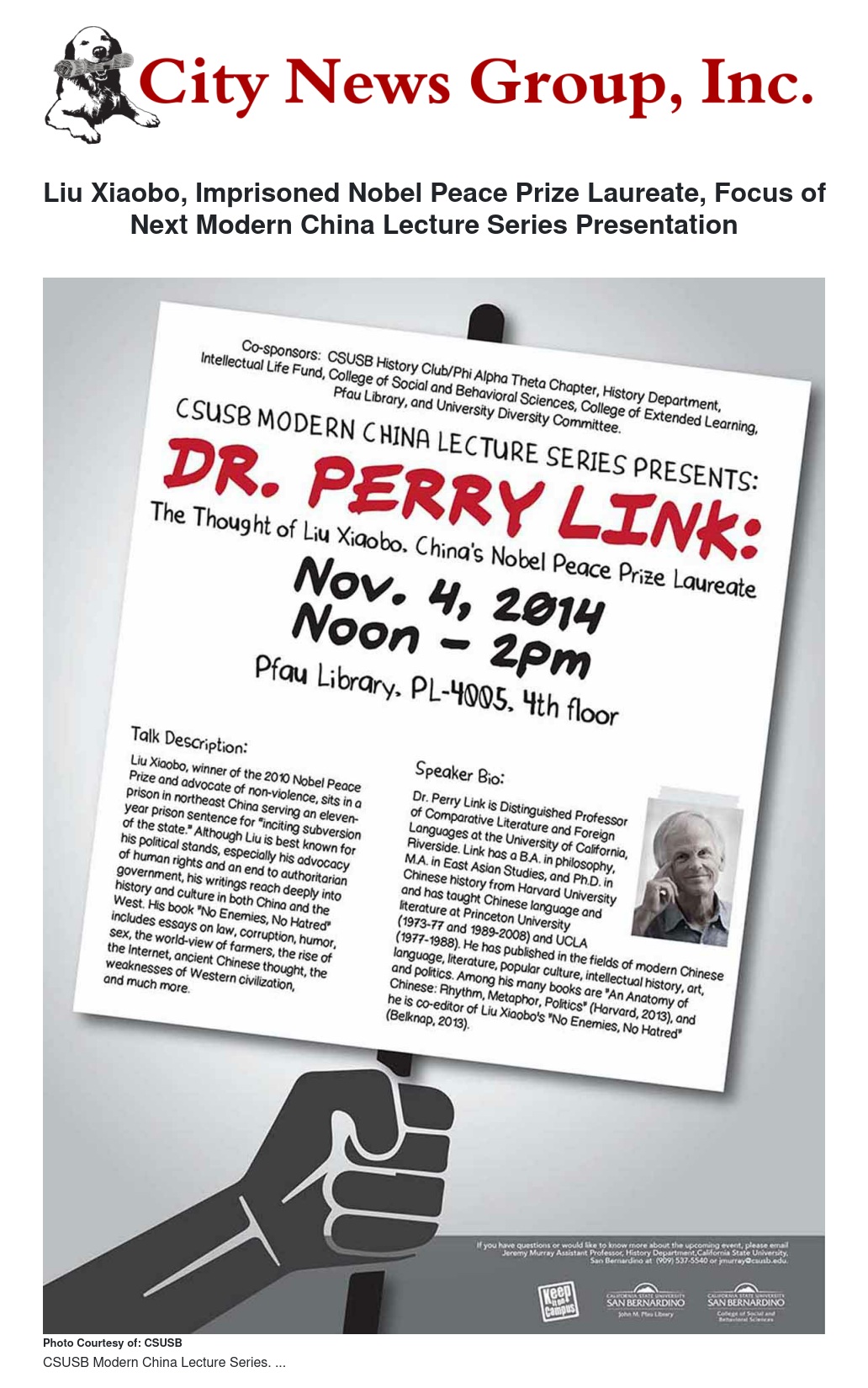 Noon on Tuesday, Nov. 4, Perry Link, who co-edited Liu’s “No Enemies, No Hatred,” presented “The Thought of Liu Xiaobo, China's Nobel Peace Prize Laureate,” as part of the ongoing Modern China Lecture Series at Cal State San Bernardino (CSUSB) in the university’s Pfau Library.