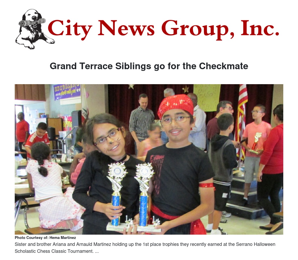 Arnauld, a fifth grader, is one year older than Ariana, a fourth grader. They both went undefeated and took the championship title home with them at the recent Serrano Halloween Scholastic Chess Tournament on Saturday, Oct. 25 held in Moreno Valley.