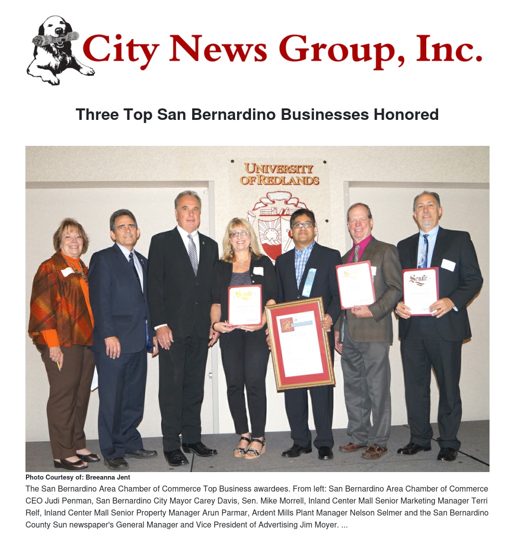 San Bernardino's Ardent Mills, Inland Center Mall and the San Bernardino County Sun newspaper were recognized as leaders in their community by State Sen. Mike Morrell Nov. 21 at the University of Redlands during the 4th Annual Top Chamber Business Awards.