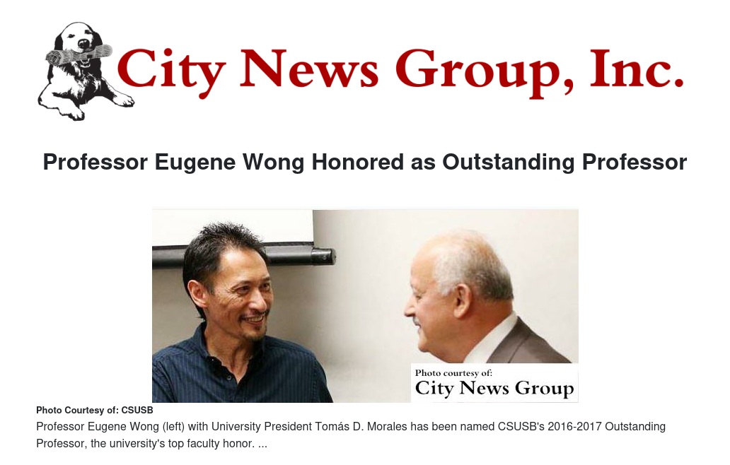 SAN BERNARDINO>> On Wednesday, April 12, CSUSB President Tomas D. Morales, along with a group of university officials, announced that Professor Eugene Wong, who joined the University in 1991, had been named CSUSB's 2016-17 outstanding professor, the university’s top faculty honor.