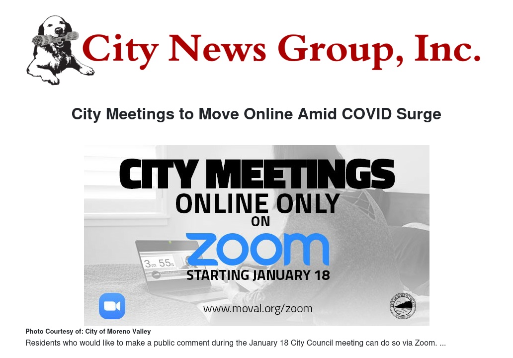 Due to the recent surge of COVID-19 infections across Moreno Valley and Riverside County, Moreno Valley City Council and Planning Commission meetings will be available online only beginning Tuesday, January 18 and lasting throughout February.