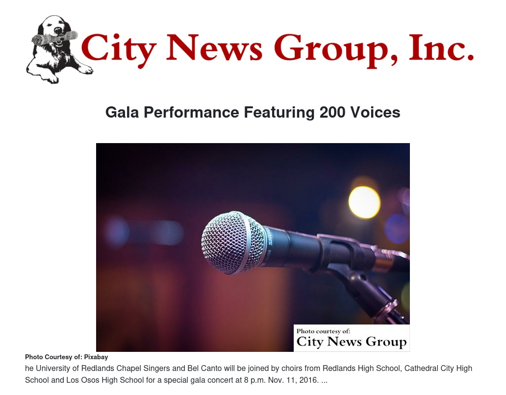 REDLANDS>> The University of Redlands Chapel Singers and Bel Canto will be joined by choirs from Redlands High School, Cathedral City High School and Los Osos High School for a special gala concert at 8 p.m. Nov. 11, 2016 in the University’s historic Memorial Chapel, located at 1200 East Colton Ave., Redlands, California.
