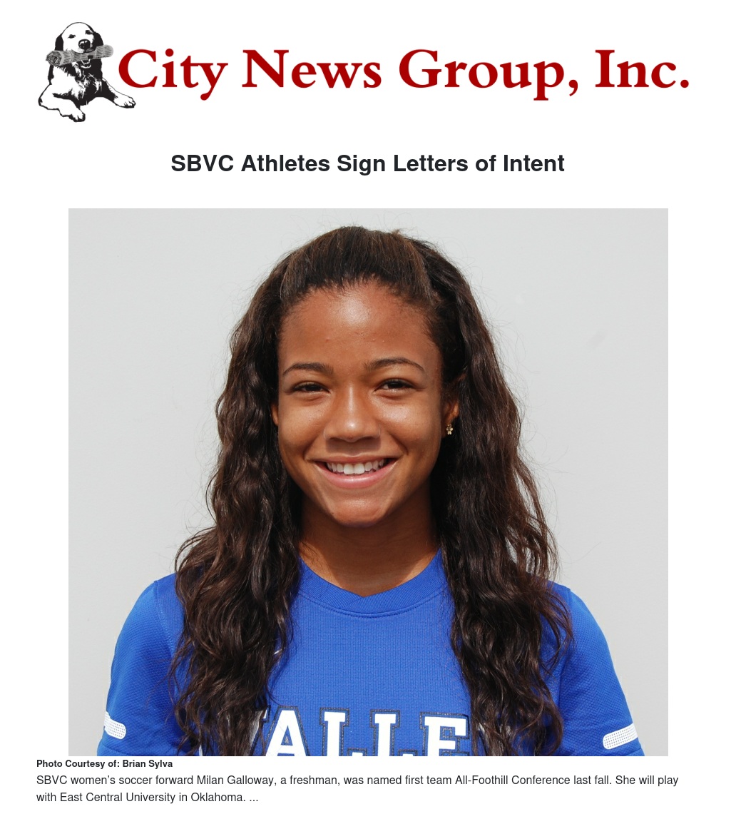 San Bernardino Valley College (SBVC) Women’s Soccer sophomore forward Milan Galloway (Wilmer Amina Carter H.S. in Rialto) has signed a letter of intent with East Central University.