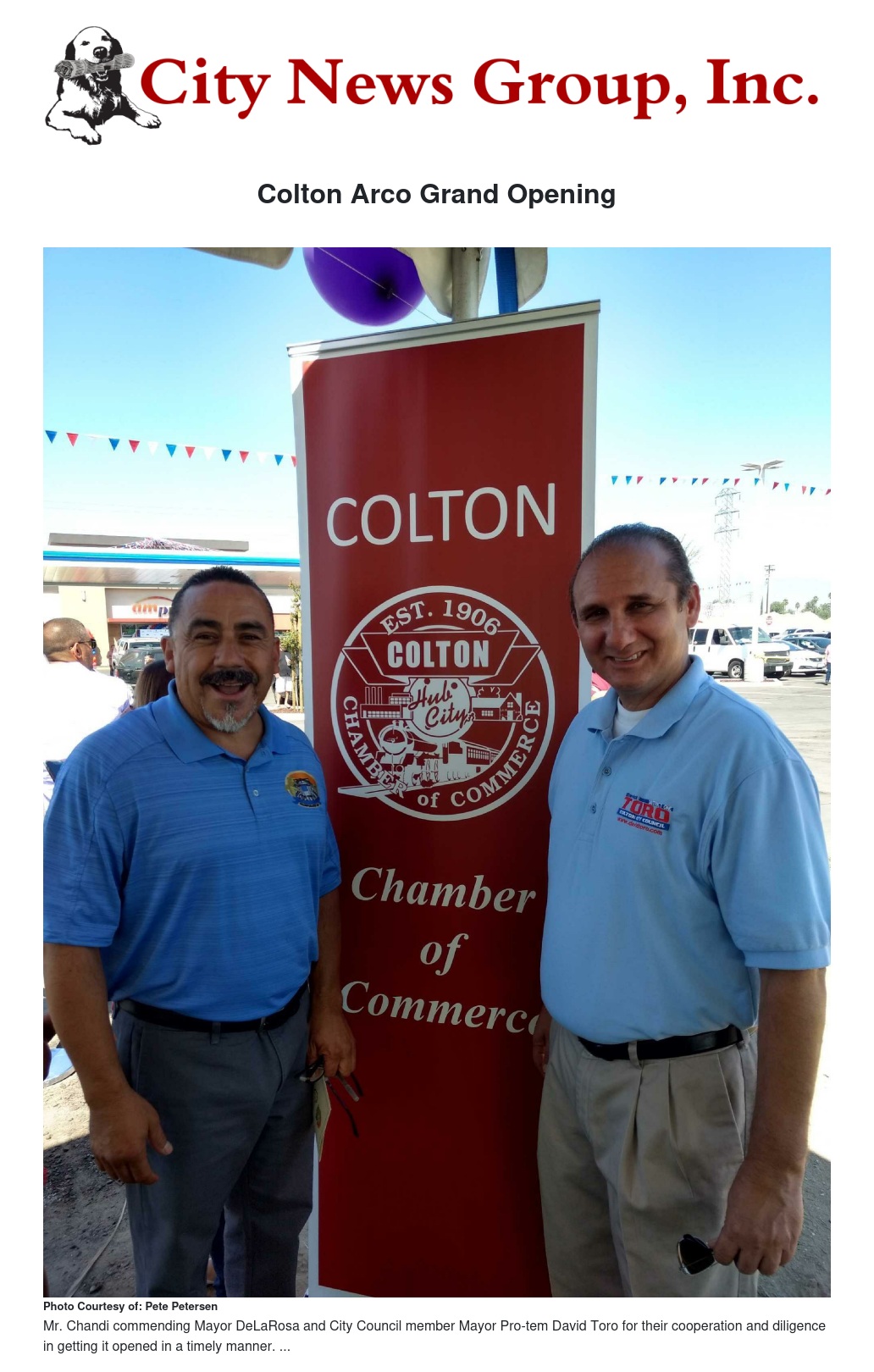On August 26, 2017, the Chandi Group held a Grand Opening of their large ARCO Fuel Station at the Colton Hub, the corner of Valley and Pepper Streets in Colton. Mayor Richard DeLaRosa said this is the first of several business attractions for our city, including a future hotel, multiple restaurants, a retail/housing complex and other businesses as opportunities become available.
