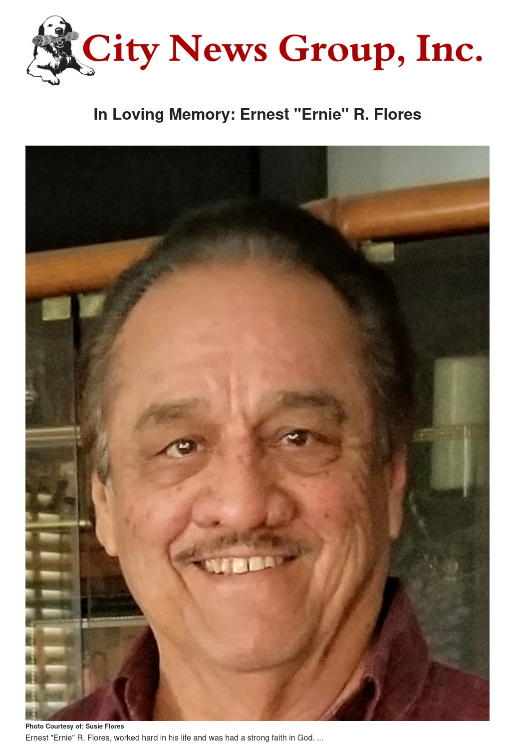 ERNEST “ERNIE” ROBERT FLORES went to be with our Lord on January 17, 2021, at age 76. He was born in San Bernardino, CA. He is survived by his son Ernest “Mijo” R. Flores, and daughters Susie Flores of Redlands/S.B. and MaryHelen (Danny) Garcia of S.B., 4 grandchildren; Daniel “DJ” Flores, Annamarie Flores, Daniel and Darren Garcia. 2 great-grandchildren; Trinia and Cashay. Brothers Ben Flores of S.B. and Juan Flores of S.B., and sisters Sylvia (Richard) Payan of Rialto and Delia Hernandez of Colton. He was preceded in death by his Beloved mom Helen Almendarez Flores of S.B. and father Gonsalo “Ben” Flores of Montclair, and brothers; Edward “Eddie” Flores, and Danny Flores of S.B.
