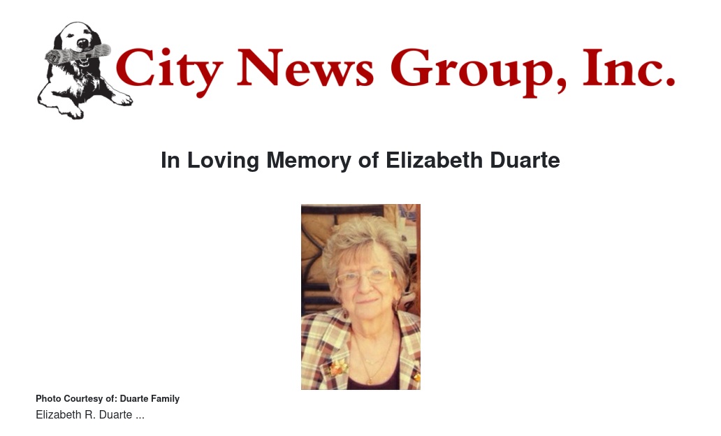 Elizabeth R. Duarte passed away at her home in Grand Terrace, CA on April 3rd, 2014. She was born on July 1st, 1939 in Boston, Mass. She and her family moved to Grand Terrace in 1978. In 1980 she began working for the City of Grand Terrace where she worked as a Senior Accounting Technician until she retired in 2000. She served as an active member of the Grand Terrace Women’s Club for many years. She was preceded in death by her husband Henry D. Duarte. She is survived by her sons Stephen and Daniel Duarte, and daughter Elizabeth Wilcox, grand children Jordan Duarte, Heather Duarte and great granddaughter Jayden Duarte-Mayer.