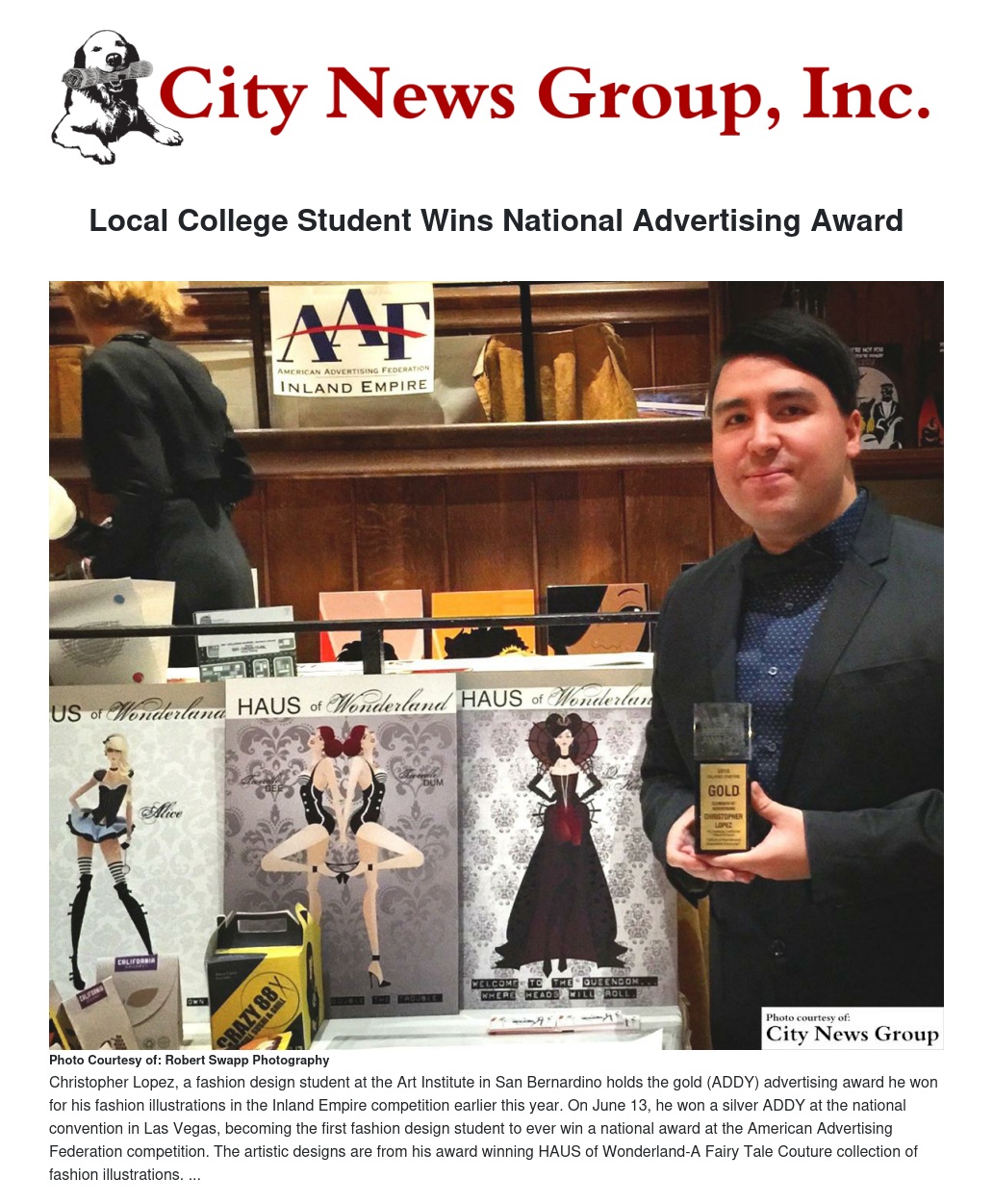 “This is a very prestigious award,” said Su Pak, president of the local chapter of the American Advertising Federation. “It’s the first time a fashion design student from the Inland Empire has advanced to win a silver award at the national level. This is a remarkable achievement and we are very proud of Chris!”