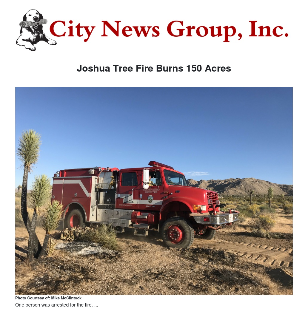 San Bernardino County Fire responded with (9) Engines, (2) Hand Crews, (2) Water Tenders, (2) Fire Investigators and (3) Chief Officers. CalFire assisted with one Engine. Joshua Tree National Park responded with an Engine and Chief Officer. Combat Center FD assisted with station coverage. Strong interagency cooperation made a positive impact on keeping the fire South of 29 Palms Highway and out of structures. CHP & Cal-Trans provided a road closure & traffic control while crews worked on the fire. Thanks to all our public safety partners for your help.