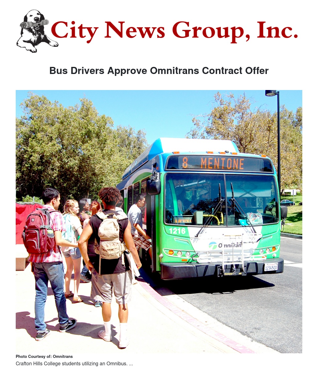 The drivers, represented by the Amalgamated Transit Union (ATU), Local 1704, voted 265 to 38 on Dec. 2 to ratify the contract offer. A wage increase and stipend were approved by the Omnitrans Board of Directors at their Dec. 3 meeting. Acceptance of the full Memorandum of Understanding will go before the Board in January.