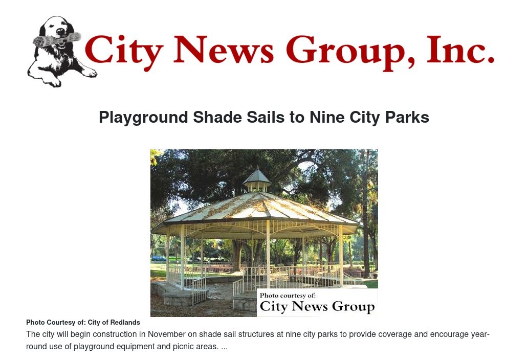 The city will begin construction in November on shade sail structures at nine city parks to provide coverage and encourage year-round use of playground equipment and picnic areas.