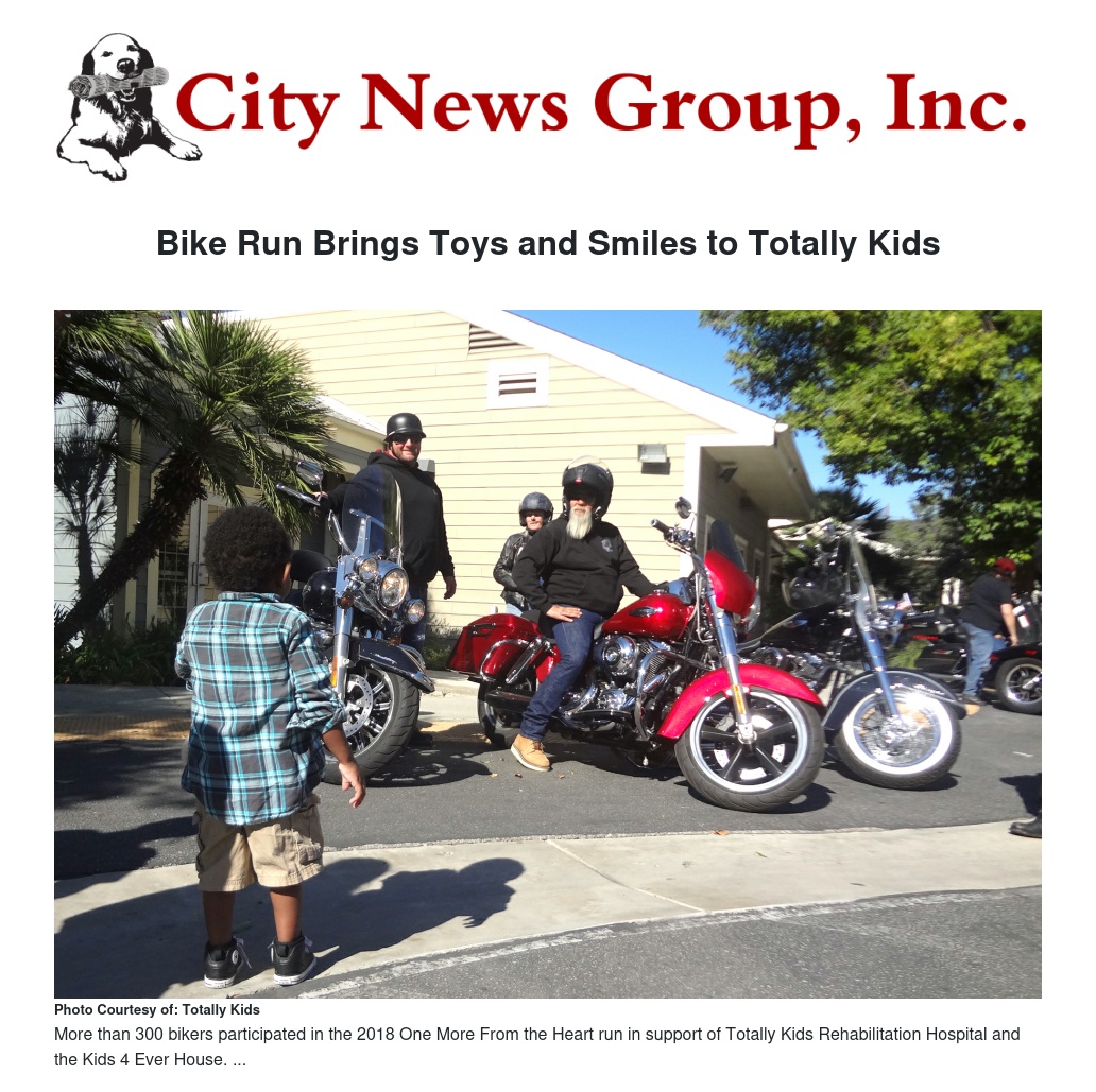 Hundreds of motorcycles arrived at Totally Kids Rehabilitation Hospital on Nov. 11, their riders bearing gifts and donations that brought smiles to the hospital’s residents. For 28 years the One More From the Heart Bike Run has been organized with heartfelt compassion by community volunteers in support of Totally Kids and the Kids 4 Ever House.