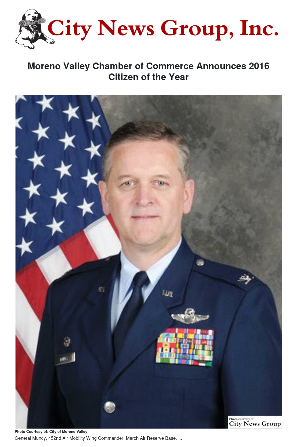 The Moreno Valley Chamber of Commerce announced its 2016 Citizen of the Year, Brigadier General Russell A. Muncy at its monthly Wake-Up Moreno Valley meeting. General Muncy will have the honor of being recognized on Friday, January 22, 2016 at the Chamber's Annual Installation and Awards Banquet.