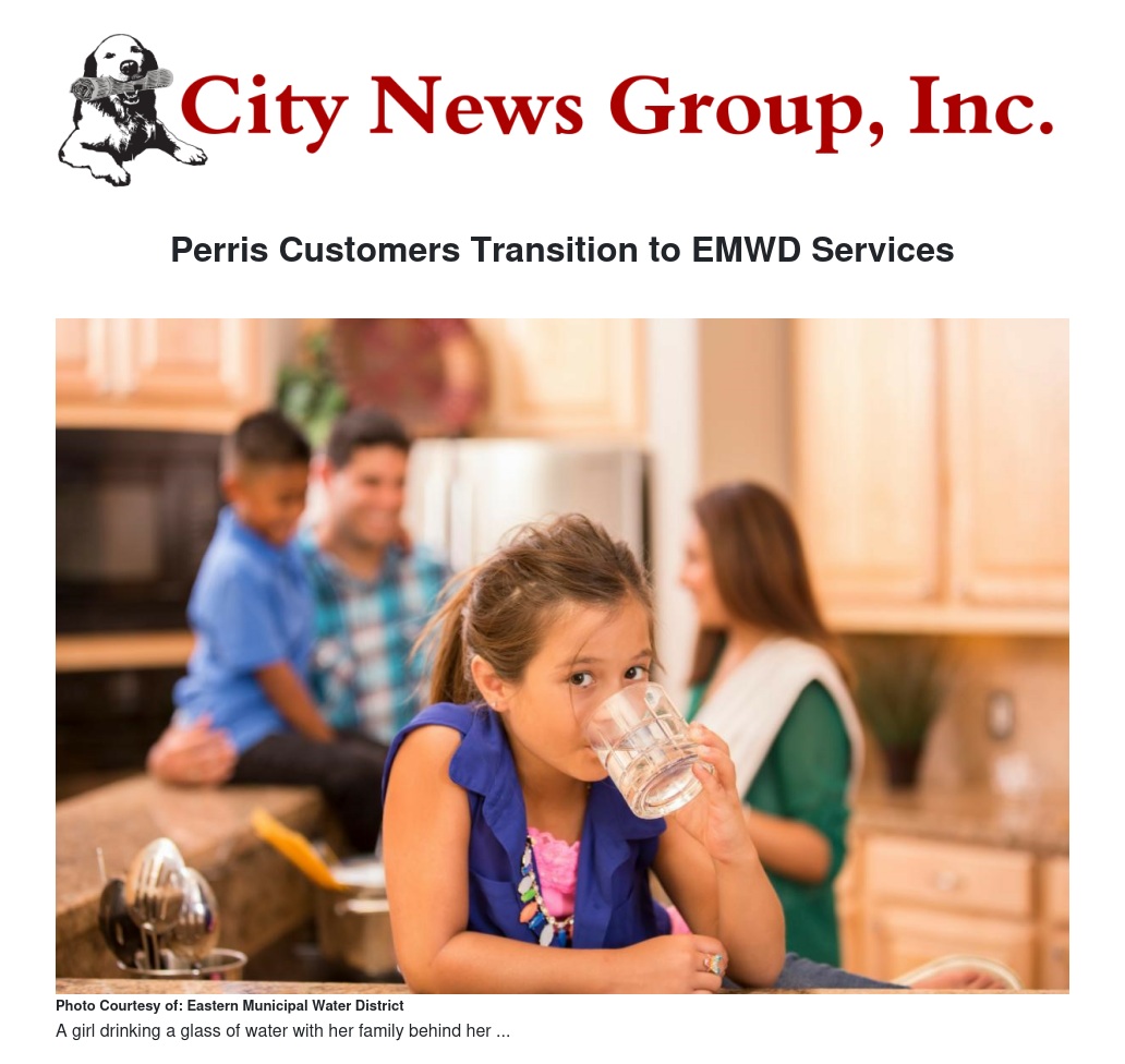 EMWD previously served approximately 80 percent of the city. Existing EMWD customers will see no financial or service-level impacts.