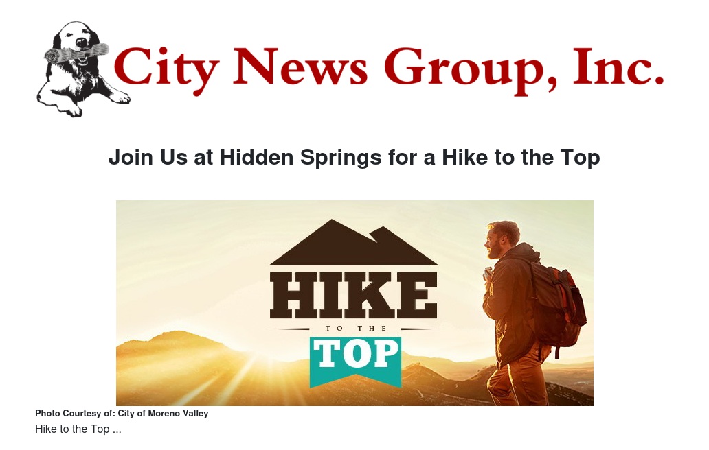 Join fellow outdoor enthusiasts for a hike to Hidden Springs on Saturday, January 27th, at 7:30 a.m. for Moreno Valley’s first “Hike to the Top” event of the year. Hikers will meet at Hidden Springs Park near the Hidden Springs Elementary School parking lot, located at 9675 Hidden Springs Drive.