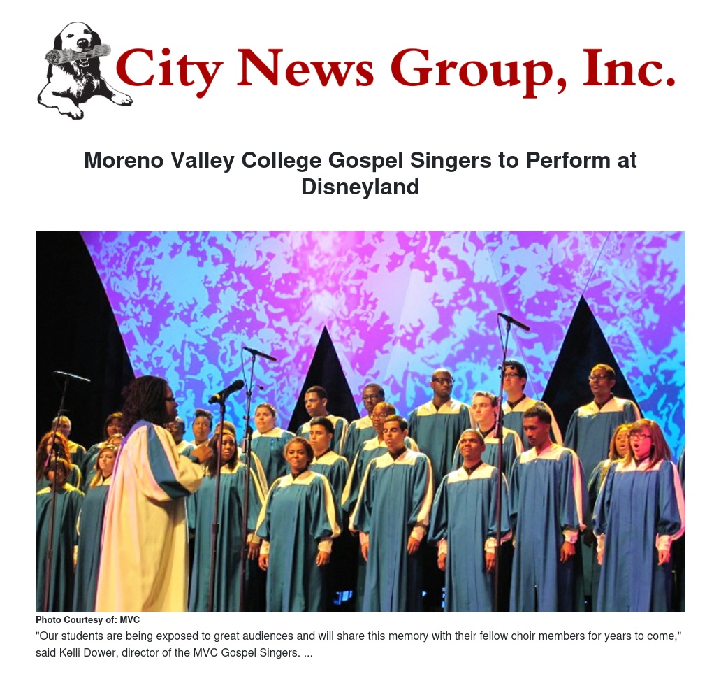 The Moreno Valley College Gospel Singers have been selected by Disneyland to perform at its Celebrate Gospel — A Day of Music, Celebration and Fun — on Feb. 15, at Disney's California Adventure Park.