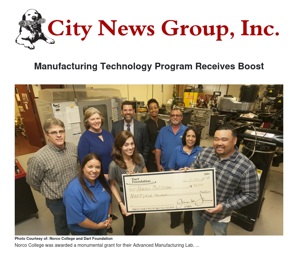 “We are grateful to the Dart Foundation for their proactive outreach and interest in partnering with Norco College,” said RCCD Foundation Director Launa Wilson. “This grant will enable the College to replace a severely outdated piece of equipment, and in doing so, enhance the learning experience for hundreds of manufacturing technology students each year.”