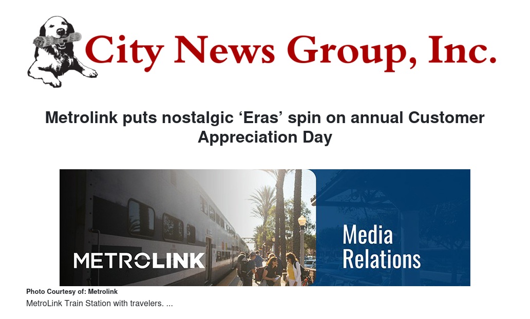 WHAT: Metrolink will celebrate its sixth-annual Customer Appreciation Day this Wednesday by surprising morning customers at six station pop-up events. In a nod to ‘The Eras Tour,’ which swept through Southern California in August, this year’s theme is “Eras: Metrolink & Metrolink Riders,” underscoring the enduring relationship between Metrolink and customers in different phases of their lives as well as the stages of Metrolink’s own three-decade service and brand evolution.