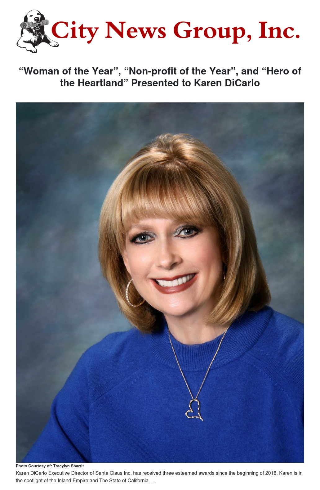 March 2018 - Karen was selected by Stater Bros. to receive the prestigious “Hero of the Heartland” award. She was humbled to be recognized by Stater Bros., an amazing company that is a cornerstone of support for so many worthy organizations. In addition to the recognition of Karen and Santa Claus, Inc. a generous financial award was presented at the Heroes Challenge Awards Dinner at the Riverside Convention Center.