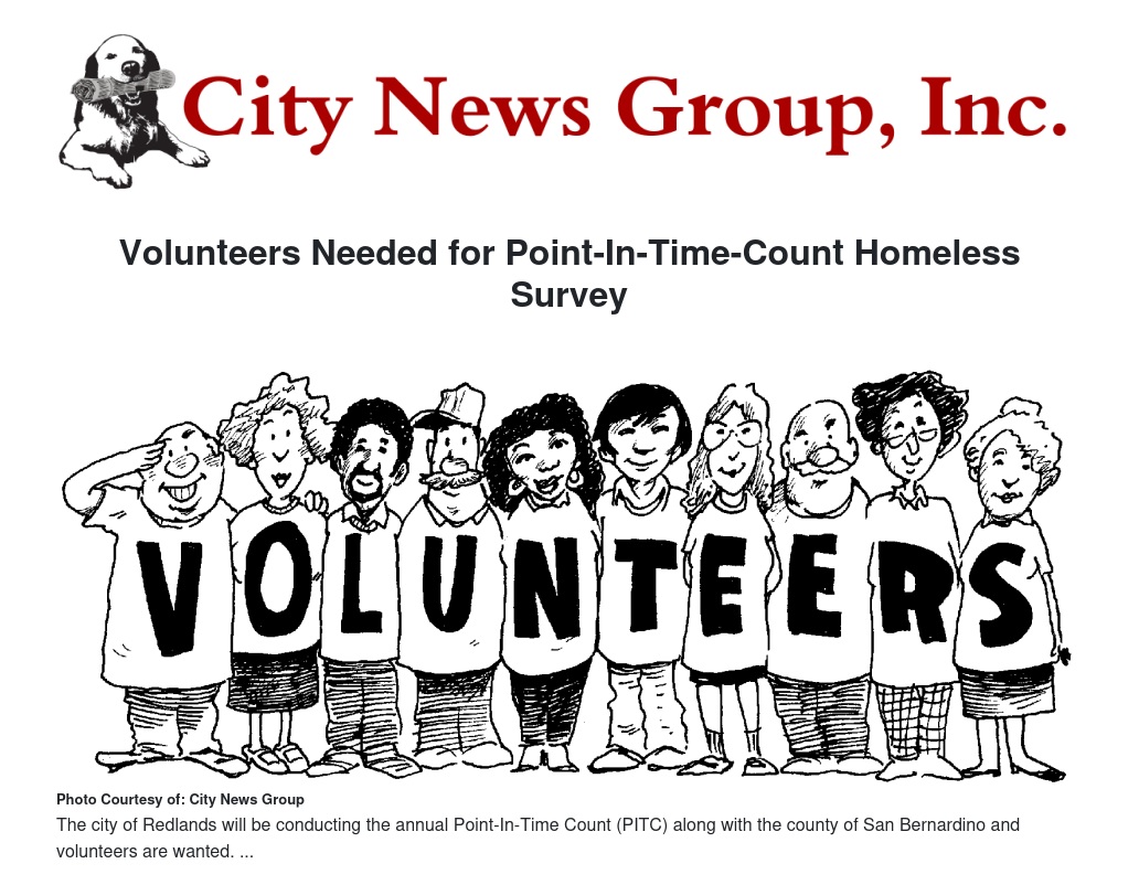 On Thursday, Jan. 26, the County of San Bernardino and the City of Redlands will conduct the annual Point-In-Time Count (PITC) of unsheltered homeless individuals.