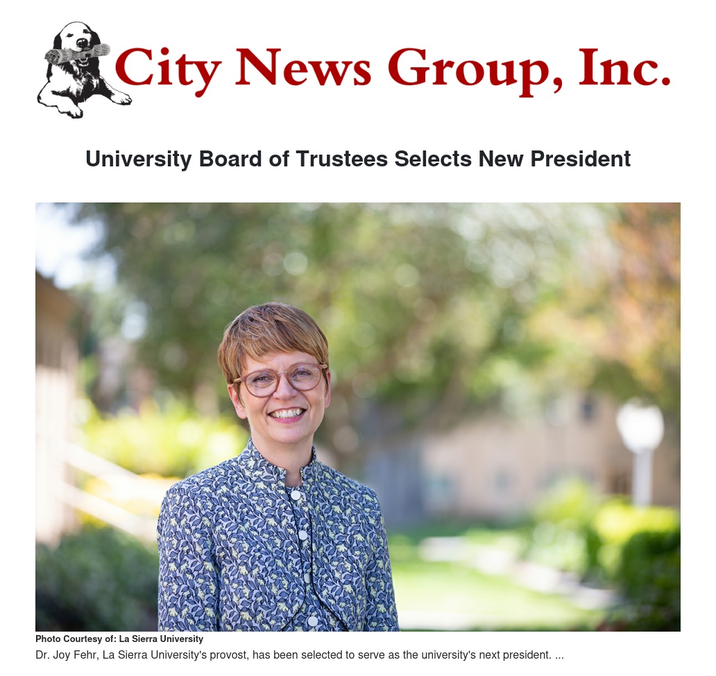 “The Board of Trustees believes Dr. Fehr is the best person available to La Sierra University at this time based on her qualifications, demonstrated experience, and the support of organizational and academic stakeholders,” said La Sierra University Board of Trustees Chair Ricardo Graham. “The search committee prayerfully went about its work under the expert leadership of Dr. von Pohle. The process was systematic with all candidates evaluated equally under the same criteria. These principles were compiled based on the valuable input the search committee received from stakeholder meetings held prior to the start of the search process. The board stands in full support of Dr. Fehr.”