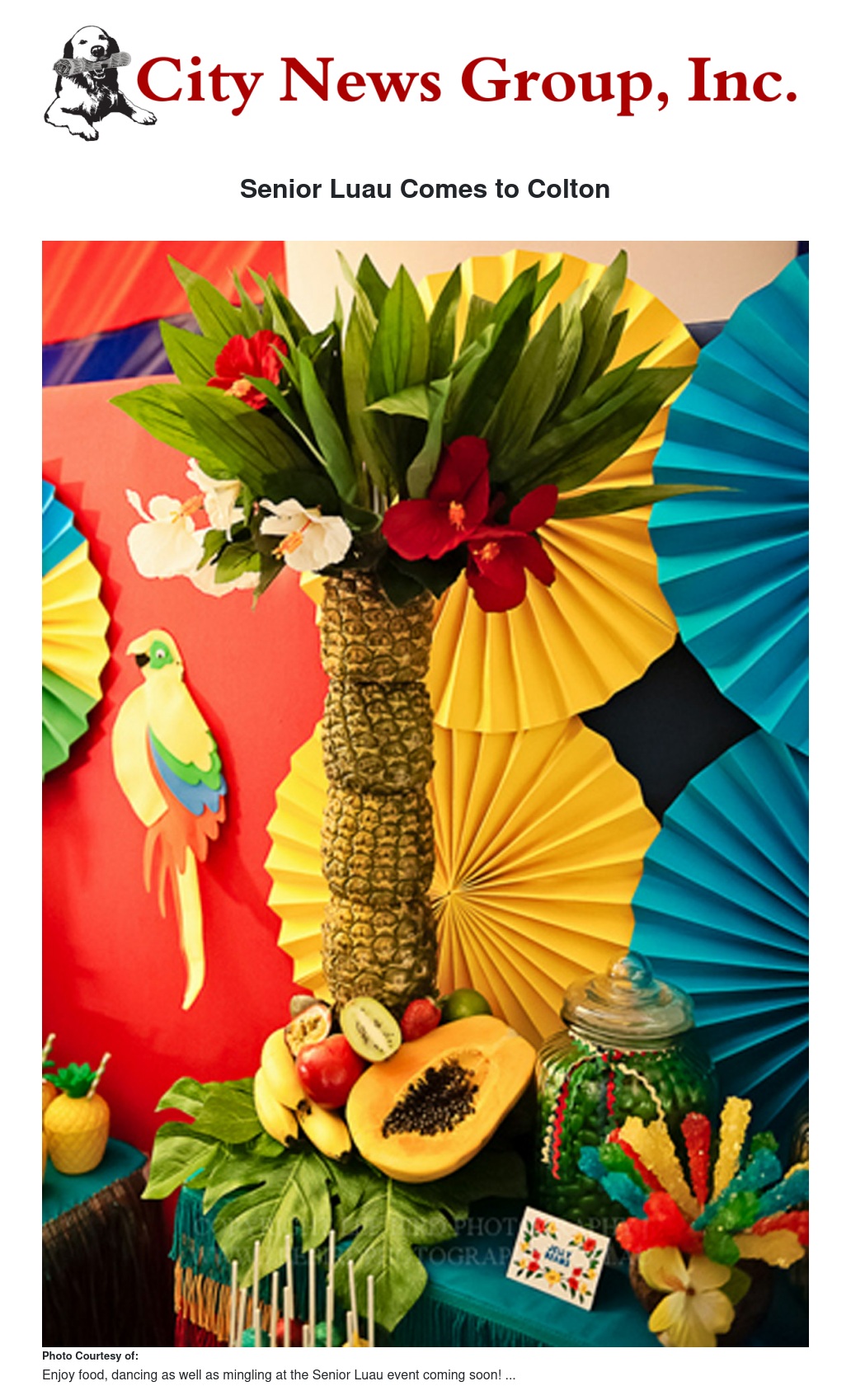 The Senior Luau will be held at the Hutton Community Center located at 660 Colton Avenue, Colton 92324. The doors will open at 12:45 p.m. The dance runs from 1 to 5 p.m.