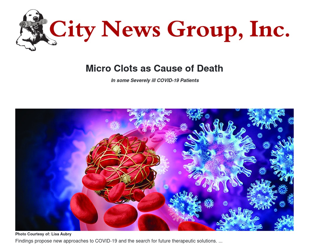 Bull and co-author Karen Hay contend that showers of tiny clots form and block micro-blood vessels in the bodies of many severely ill COVID-19 patients. Though invisible to the naked eye, the micro clots can damage and kill tiny portions of whichever organ tissue — brain, heart, liver, kidney, lung, etc. — the blocked blood vessels feed.