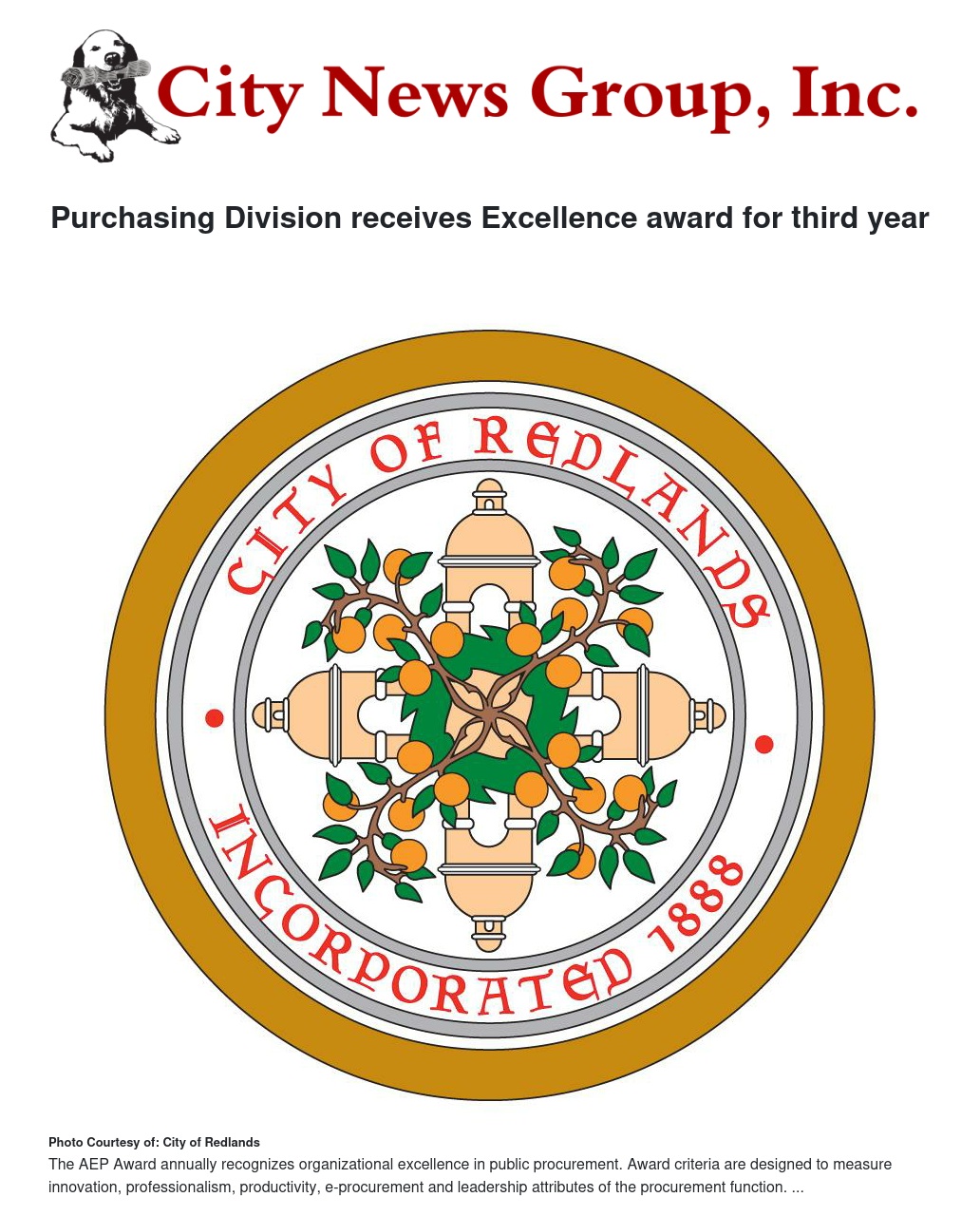 The City of Redlands Purchasing Division was recently named a recipient of the “Achievement of Excellence in Procurement” Award for the third straight year from the National Procurement Institute, an organization that promotes excellence in governmental and institutional procurement.