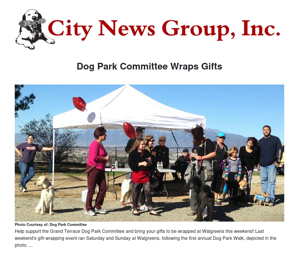 This is the second year that these volunteers have provided the service to busy holiday shoppers and at the same time raised money to complete the long-awaited Grand Terrace Dog Park. The event last Saturday occurred after the first annual Dog Park Walk, where a group of supporters and their dogs braved the blustery winds as they walked from Walgreen’s to the park site at 22700 Vista Grande Way.