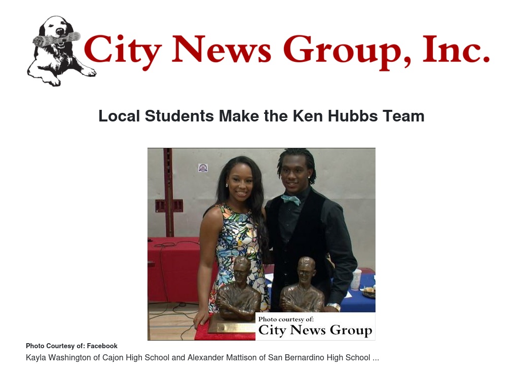 Kayla was the first Cajon winner in the five year history of girl’s awards being handed out and Alexander was the first overall winner from San Bernardino since Richard Murrell won in 2005. Alexander said, “When I first heard about this award in my sophomore year, I felt I could be a contender and I made it my goal to work hard to try to accomplish what is happening tonight. I was very humbled by what Keith Hubbs (Ron’s brother) said tonight about his brother.” Alexander has earned a football scholarship to play for Boise State next year.
