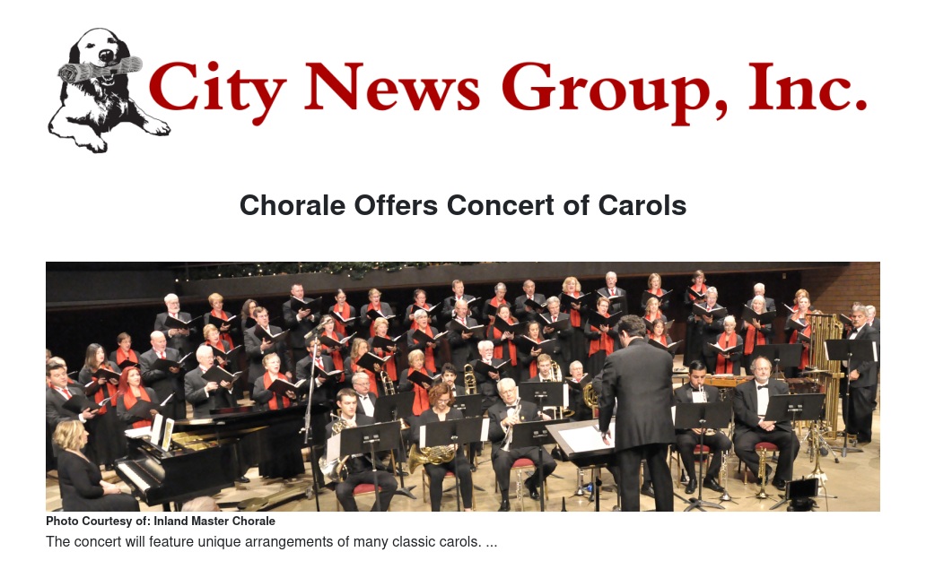 The Inland Master Chorale presents “Caroling, Caroling” on Sunday, December 19 at 4 pm at the University of Redlands Memorial Chapel, 1200 E. Colton Avenue, Redlands.