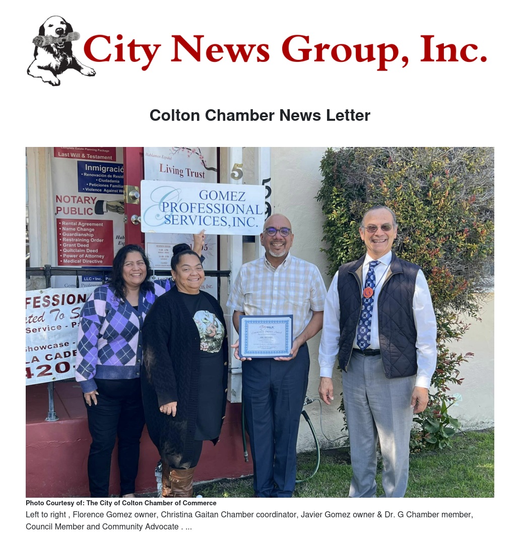 The Colton Chamber of Commerce is running a little behind schedule on presenting The Grand Marshal Daneil Muro his plaque of appreciation & their Colton Christmas parade sponsorship appreciation Certificates for 2023 . Two of the twelve were presented on February 22 , 2024 to Gomez professional Services INC. & also to DR. Luis Gonzales The two were The Colton Chamber of Commerce parade sponsors . The other sponsors will be given their Certificates at The Chamber's next Rise n Shine march 5 ,2024 along with the Chamber's new members for 2024 . The Chamber has started the year off with seven new members for the month of February. We like to introduce Armada Towing INC , Masterbrand LLC, California University of Science & Medicine , AMCAL Automotive , Grand Terrace Hospice , Wood springs Hotel ,& Dental Center of Colton . The Chamber would like to thank all their member's and Friends of the chamber for all their support with their past events and future events. The Chamber is planning some events for the spring and fall of 2024 . please follow us on Face book at Colton Chamber of Commerce or our website at WWW.Coltonchamber.org . If interested in becoming a member please call the office at 909-825-2222 or 909-235-0586