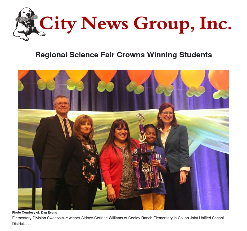 Three San Bernardino County students won Sweepstakes Awards for the outstanding project in their respective divisions. The Sweepstakes winners were: Sidney-Corinne Williams of Cooley Ranch Elementary in Colton Joint Unified School District (Elementary Division); Noah Cain of Ranchero Middle in Hesperia Unified (Junior Division); and Laura Noronha of Redlands High in Redlands Unified (Senior Division).