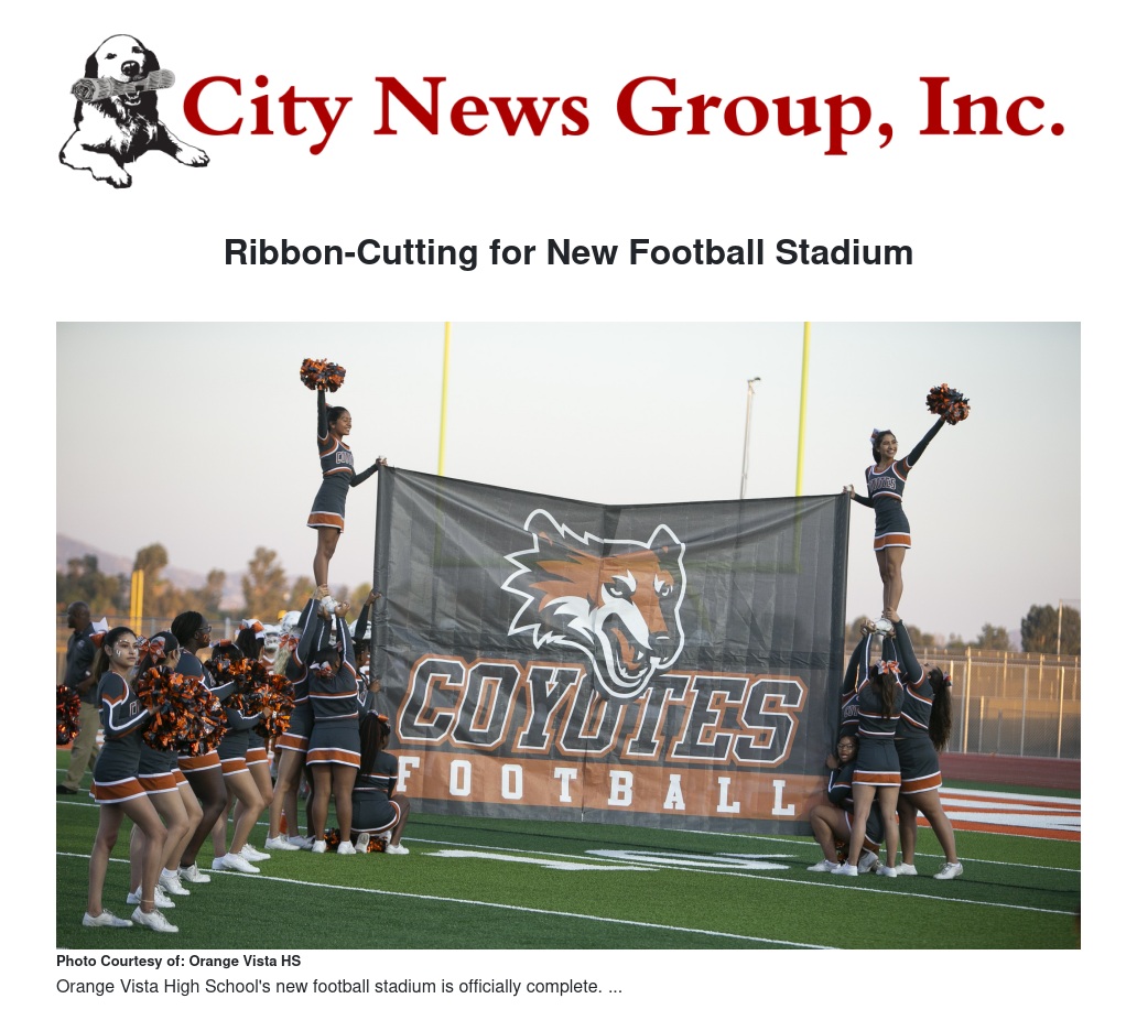 Orange Vista High School held a ribbon cutting ceremony on Friday, September 7, 2018 to celebrate the completion of their new stadium. The ceremony which brought together District officials, city of Perris officials, Orange Vista staff, students and community, was the symbolic opening of the new home of the Coyotes.