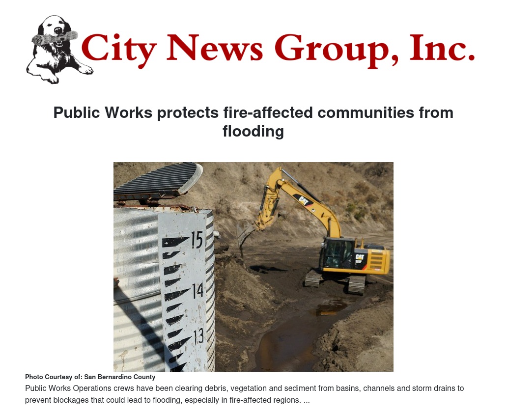 The Flood Control District (FCD), part of San Bernardino County Public Works, has been consistently coordinating with CalFire, the Burned Area Emergency Response (BAER) team and the California Watershed Emergency Response Teams (WERTs) to establish a plan for preparing for future floods and debris flows in the affected areas of our county. Public Works Operations crews have been clearing debris, vegetation and sediment from basins, channels and storm drains to prevent blockages that could lead to flooding, especially in fire-affected regions. Flood control teams are on standby 24/7, ready to respond as storms approach. Pre-staged equipment has been strategically placed across the county for quick mobilization.