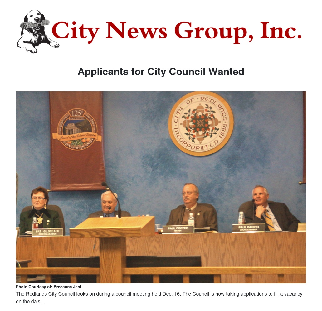 The City Council is taking applications to fill a vacancy left on the dais following the resignation of Pete Aguilar, the former Redlands mayor who has been elected to Congress.
