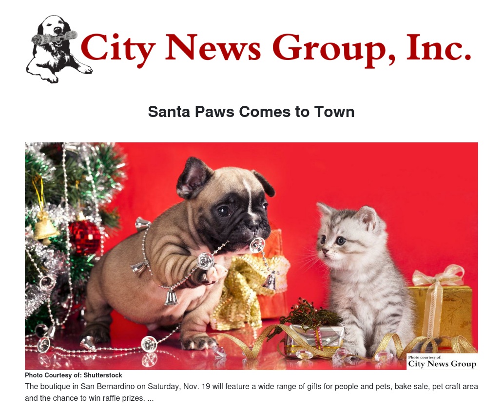 SAN BERNARDINO>> Pet and pet owners are invited to the Santa Paws Pet Photos and Holiday Boutique on Saturday, Nov. 19 at the Humane Society of San Bernardino Valley, located at 374 W. Orange Show Road, San Bernardino.