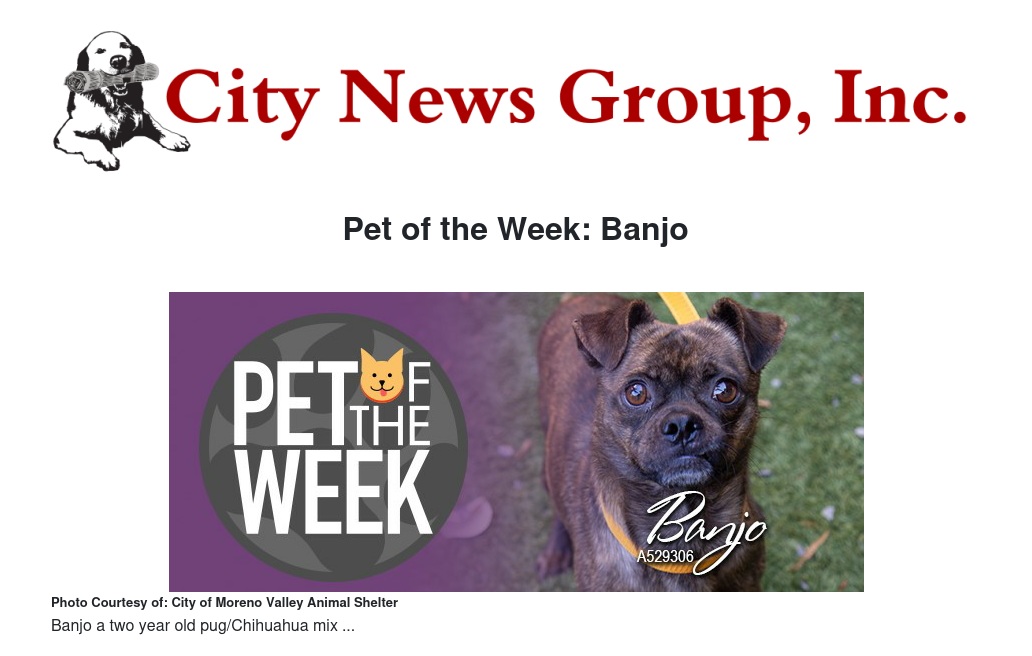 If you would like to make Banjo or any pet from the Moreno Valley Animal Shelter part of your family, please contact the Moreno Valley Animal Shelter at 951.413.3790 or visit www.moval.org/pets. |