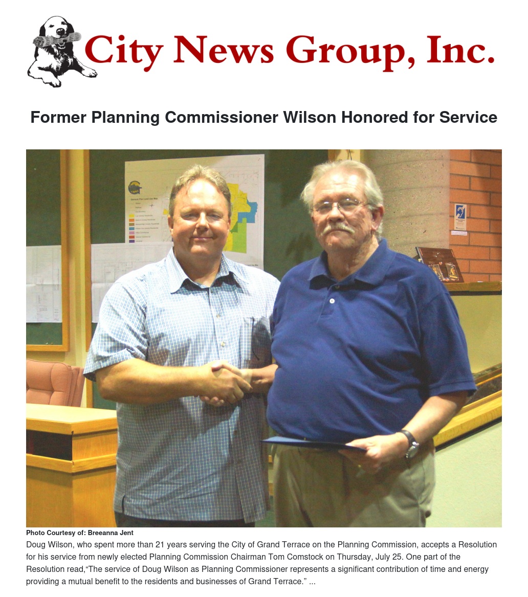 On Thursday, July 25, the Grand Terrace Planning Commission recognized Doug Wilson during a regular Planning Commission meeting, honoring him for his years of service to the Commission and to the City of Grand Terrace.