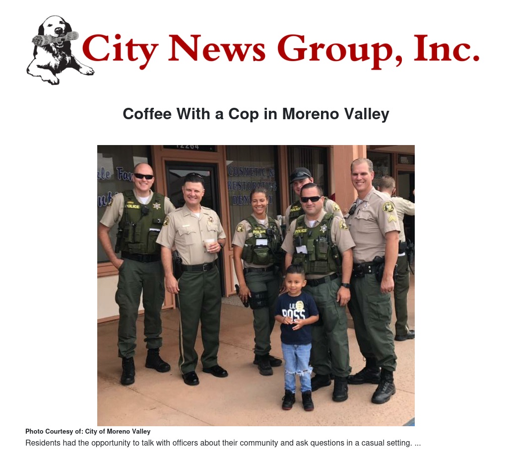 For more information about the Coffee with a Cop program, please contact Deputy Moreno at 951.486.6717 or dmoreno@riversidesheriff.org