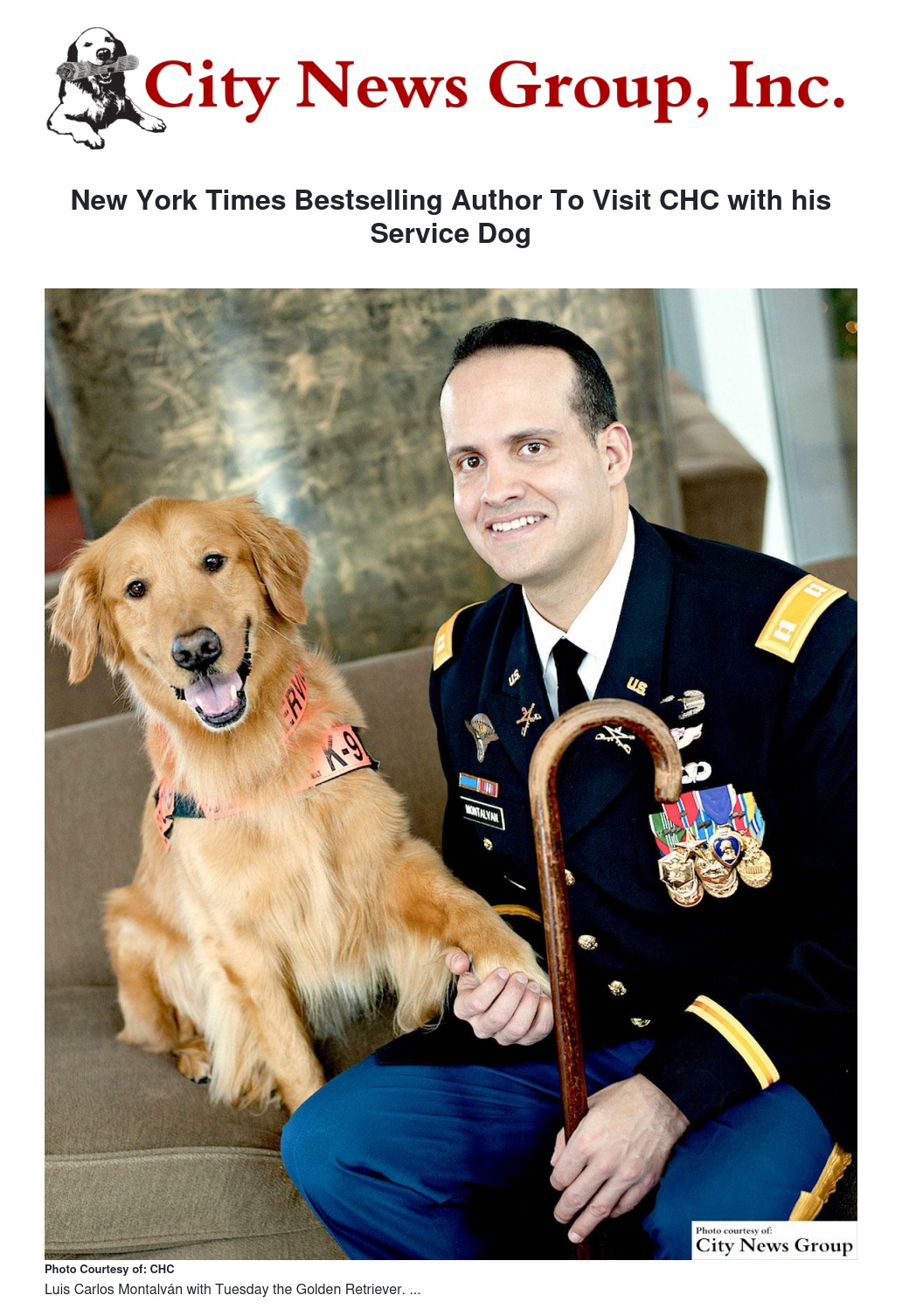 New York Times Bestselling Author To Visit CHC with his Service Dog