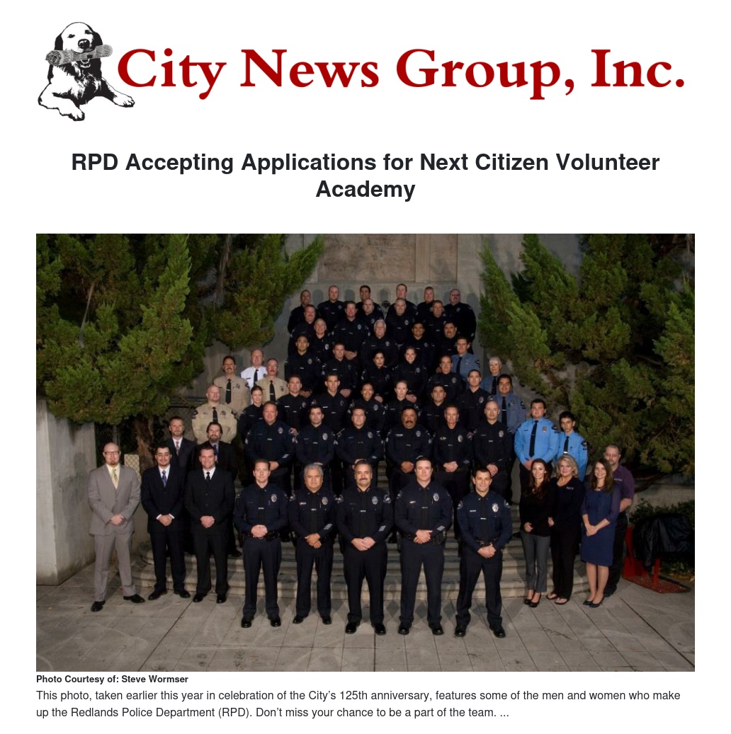Applications are now being accepted for the next Redlands Police Department Citizen Volunteer Academy which will be held early next year.