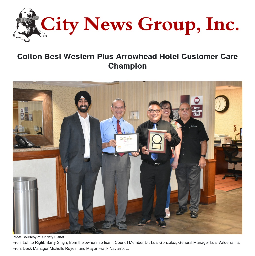Colton Best Western Plus Arrowhead Hotel Customer Care Champion by Christy Elshof - City News Group, Inc.