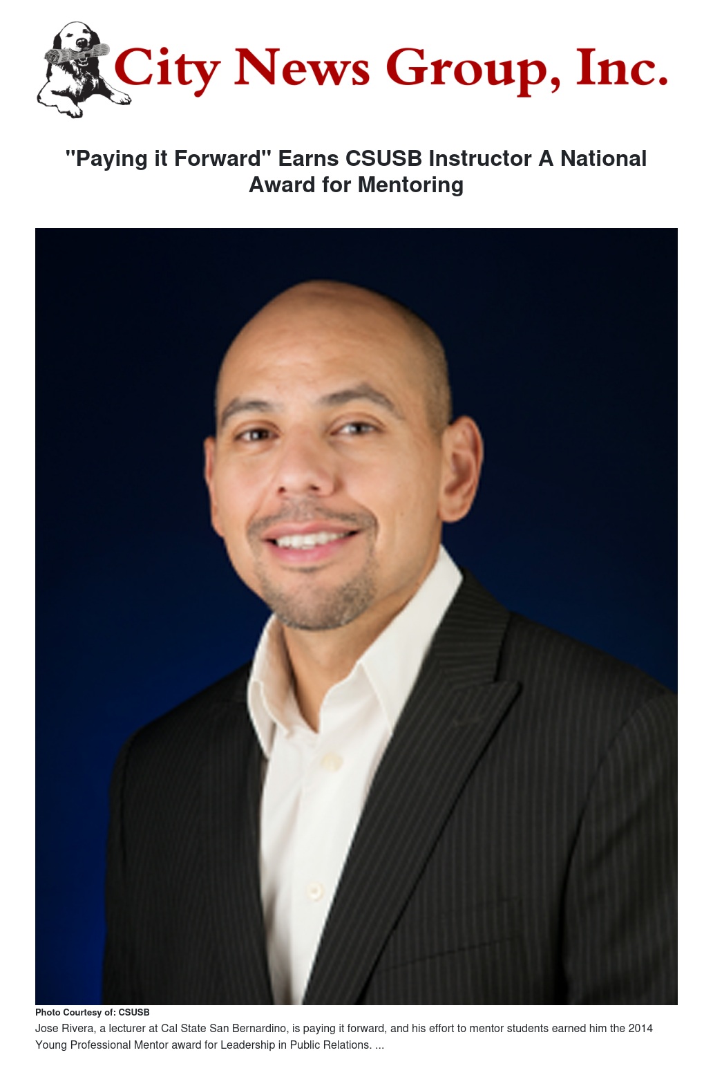 Jose Rivera, a lecturer at Cal State San Bernardino’s communication studies department and a CSUSB alum, is paying it forward, and his effort to mentor students earned him the 2014 Young Professional Mentor award from the University of Alabama’s Plank Center for Leadership in Public Relations. Rivera will be one of six honored at the 2014 Milestones in Mentoring Awards Banquet in Chicago on Oct. 30.